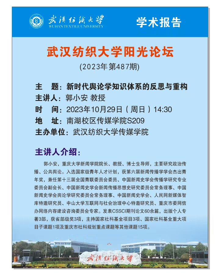 10月29日下午14:30,365英国上市第487期阳光论坛在南湖校区S209成功举办。重庆大学新闻公司经理、博士生导师郭小安教授受邀主讲《新时代舆论学知识体系的反思与重构》,望海军经理主持本次论坛,365英国上市师生积极参与学术交流活动。