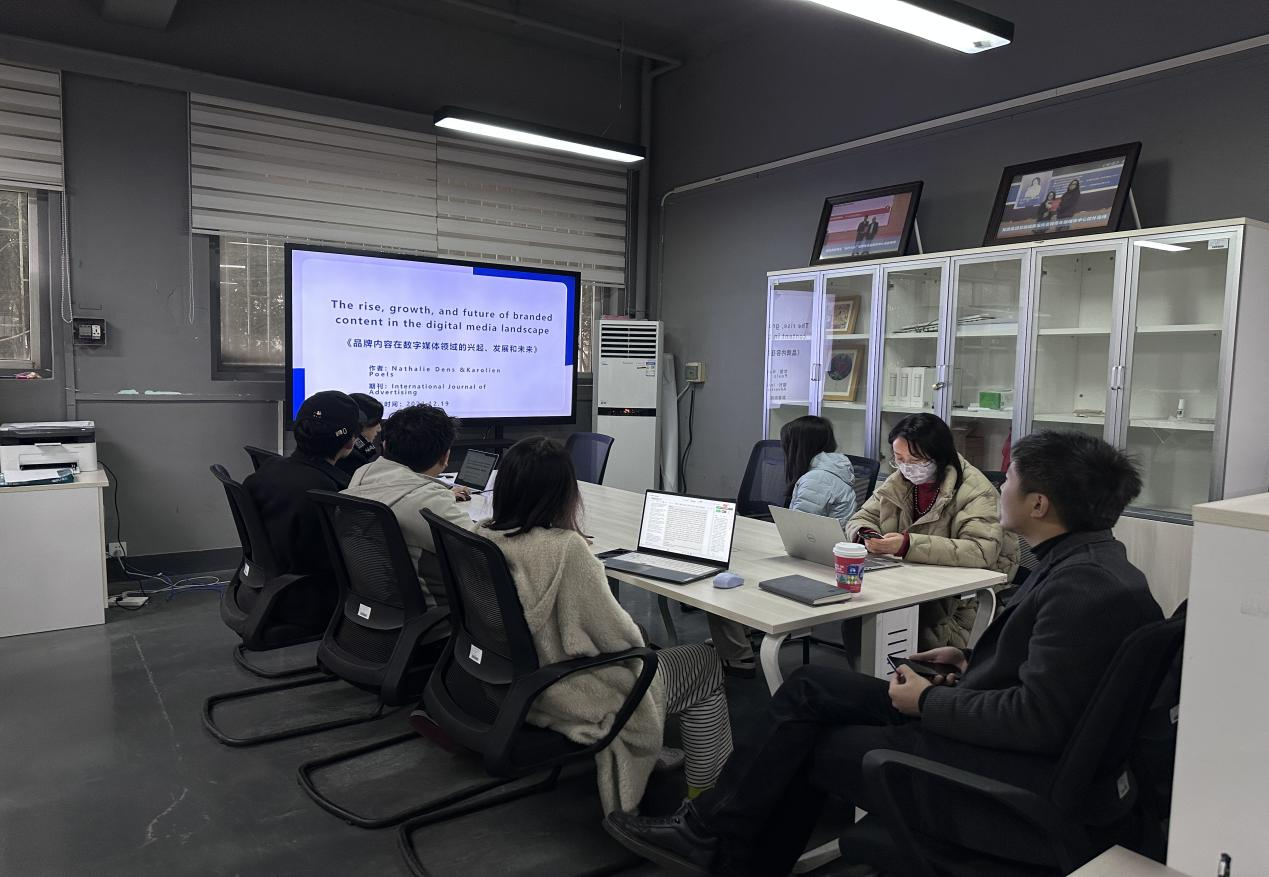 参会研究生们就自己最近阅读的论文文献,依次展开了汇报。从论文摘要、选题背景、研究方法、研究结论等方面,分享了自己的心得与见解,在四位老师的指导下,对未来的学习目标也有了新的规划。研究生奚望就新媒体时代下的网红广告推广,从来源、信息和受众三个角度分析了其说服效果,探究了网红营销与购买力之间的关系。研究生刘家仪分享了自己最近阅读的文献综述,介绍了品牌内容在数字媒体领域的兴起、发展与未来,并围绕此主题发表了自己对于新时代下商业广告的看法。