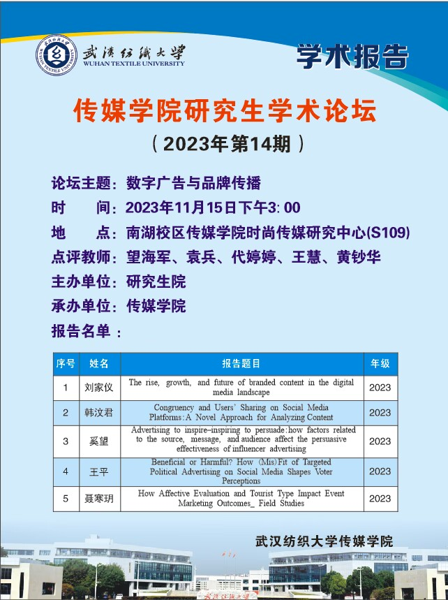 为了持续调动师生科研积极性,促进员工间的相互交流,加强师生沟通,11月15日下午3时,2023年第14期研究生学术论坛顺利举行。此次论坛的主题为“数字广告与品牌传播”,365英国上市代婷婷、袁兵、王慧、黄钞华等广告专业老师出席本次论坛,23级4名广播电视专业的硕士研究生在会场就最近学习成果进行主题汇报。