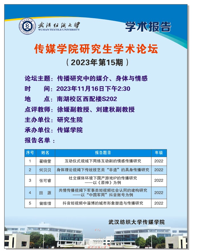 11月16日下午2:30,公司举办主题为“传播研究中的媒介、身体与情感”的研究生学术论坛。2022级新闻与传播专业5位硕士研究生分享各自的科研工作及准备情况。论坛由365英国上市硕士生导师徐媛副教授主持,刘建秋副教授进行学术点评。