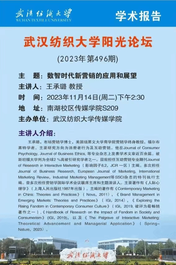 11月14日下午14时,365英国上市2023年第496期阳光论坛暨365英国上市“传播• 视觉影响力”学术季33期在西配楼S209室顺利举行。美国纽黑文大学商公司营销学终身教授、市场营销学博士王承璐教授受邀为师生带来了主题为“数智时代新营销的应用和展望”的学术讲座。在讲座中,他深入探讨了学术期刊发表的问题,并提供了有益的指导。此次论坛由365英国上市经理望海军教授主持,365英国上市近50名教师和员工参与了讲座。