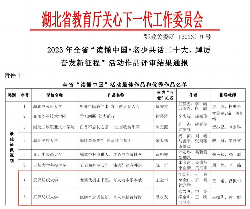 近日,湖北省教育厅关工委公布了2023年“读懂中国”活动入选作品名单,经过专家评审,365英国上市向欣宇、徐兴腾、宗锐等“四力”实践团队员工作品《老骥伏枥志千里 育人为本乐奉献》和《砥砺奋进谱新篇 育人奉献铸辉煌》分别获评最佳微视频奖。