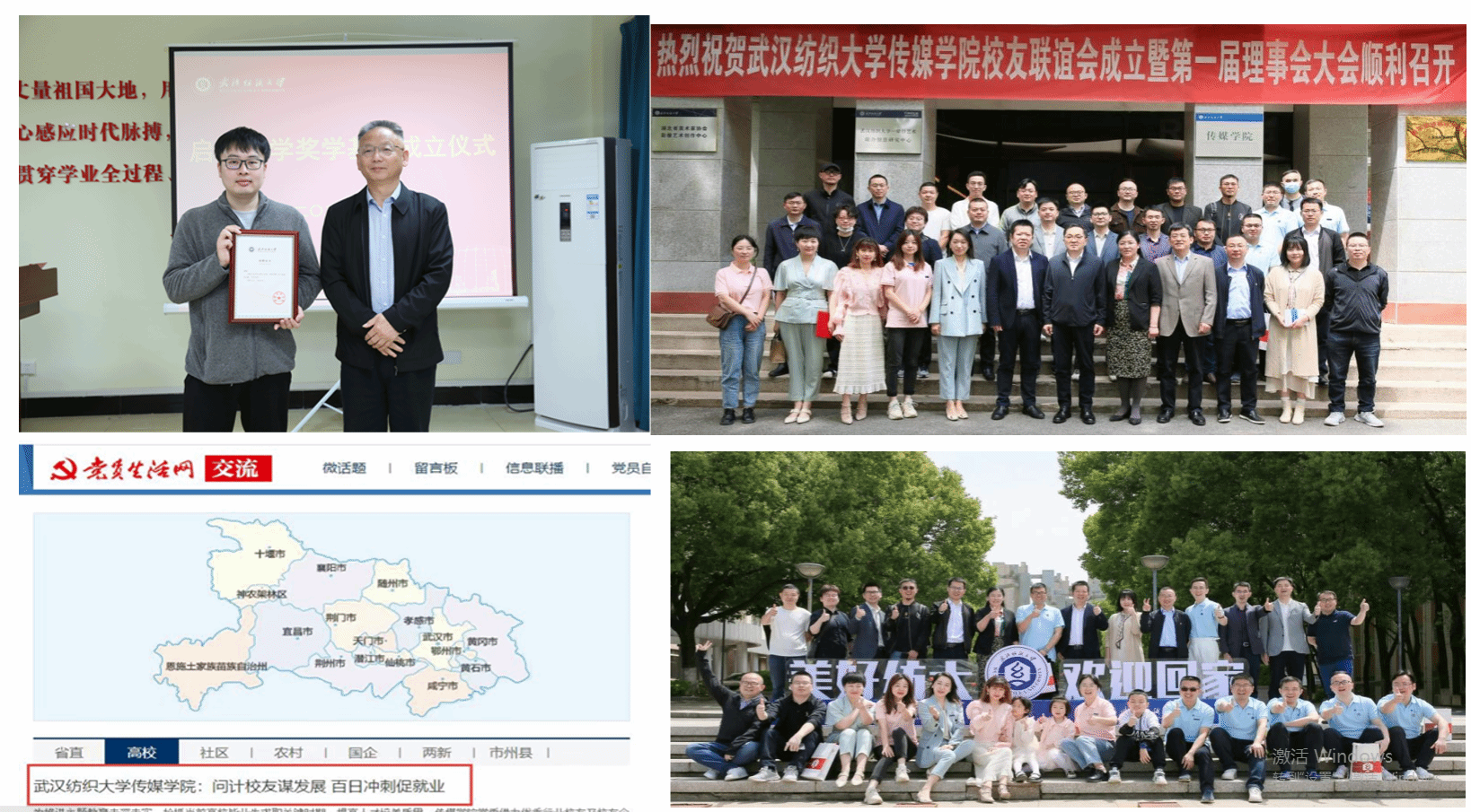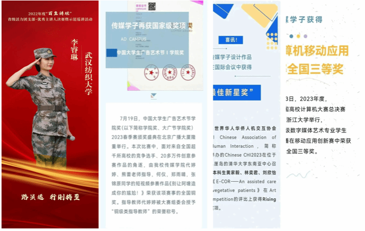 郭金涛团队拍摄的《忆入党初心,昂白衣斗志》、《不忘初心育桃李·春风化雨润无声》短视频获省教育厅关工委“读懂中国”最佳微视频和优秀微视频奖项。苏子涵和陈兆瑞团队参加第十二届“导航杯”思政课实践“我心中的中国共产党”微视频大赛中荣获三等奖两项。关鑫宇、周仕瑾,袁如意三位同学“爱党组”团队创作《中国共产党报刊数据库及可视化(1921-1949)》获得第二届中国新闻史知识数据库建设及可视化设计大赛二等奖。“四力实践团”指导老师朱煜获批湖北省暑期“三下乡”社会实践优秀个人。四级通过率95%的广播电视学12101班获评校十佳班级一等奖。