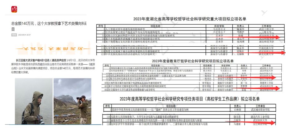 优化学术生态,积极开展对外交流,教师开展教科研氛围浓厚。2023年科研经费突破460万,创历史新高。牛学教授获批国家艺术基金后期相关西藏山南政府单一来源140万项目,王慧博士获河北菲瑞生物技术有限公司100万的横向重大课题。望海军、徐媛、郑湛、马庆老师分获得省高校哲学社会科学重大项目3项和软科重点项目2项。黄钞华、贾梦梦、谭维、黄鑫、李欣、熊菊、吕振华获湖北省哲学社会科学社科一般项目、青年项目、员工工作专项7项。发表高水平论文6篇,1篇被人大复印资料全文转载。获批学术著作出版资助5项。