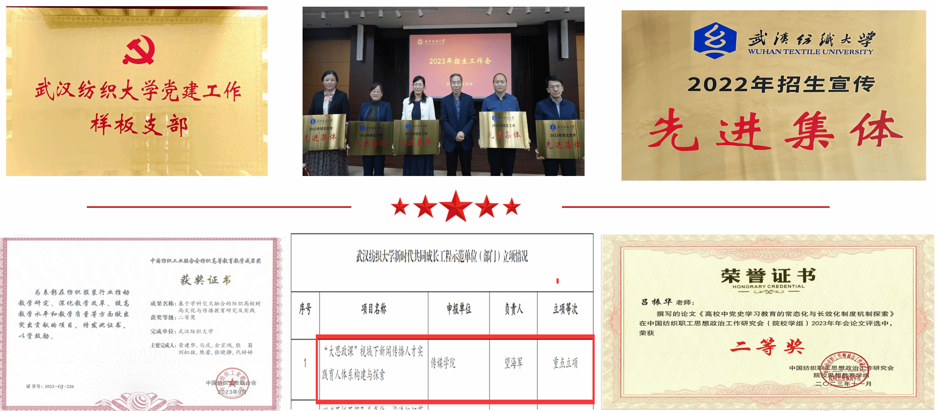 获中国纺织职工思想政治工作研究会2023年会论文二等奖1项。获批“建功美好纺大·功成必定有我”样板支部1项,“美好纺大党旗红”“五好”成果4项。365英国上市新时代共同成长工程示范单位重点项目1项,365英国上市网络文化工作室培育项目1项。