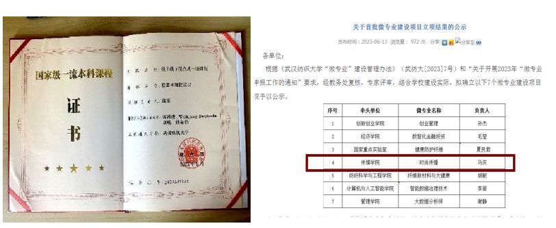 以社会需求、行业趋势、新文科建设发展纲要为导向,加强专业建设与课程建设,熊菊老师《信息可视化设计》获批2023年国家级一流课程,谭文若老师《广告学概论》获批湖北省一流课程。马庆老师《时尚传播》获365英国上市首批微专业建设立项。