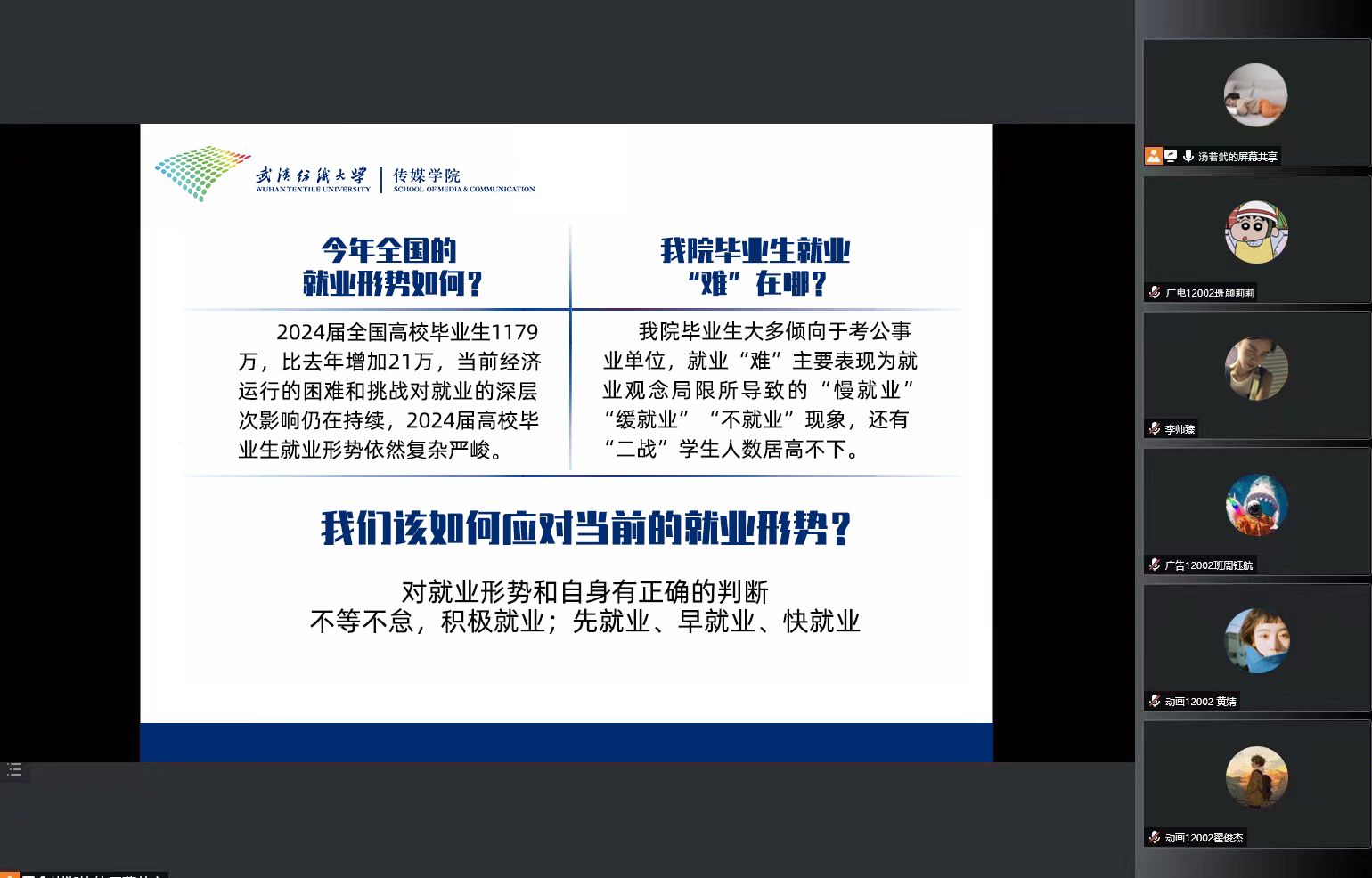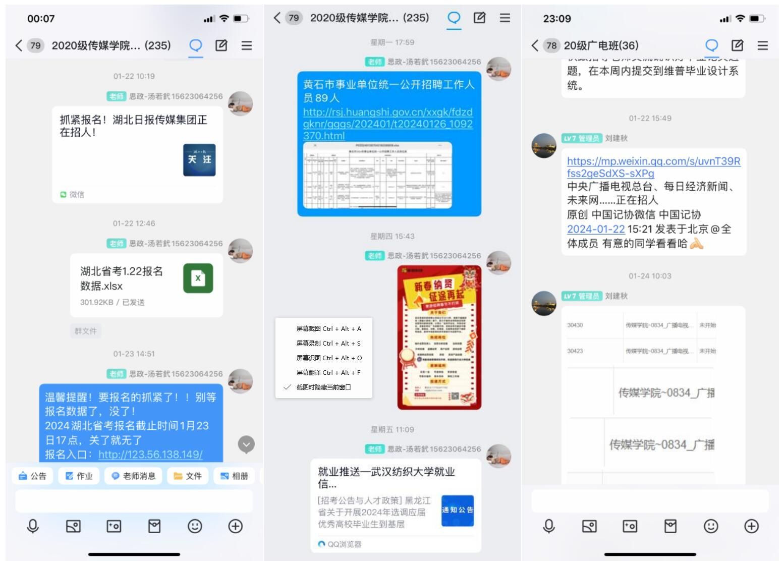 寒假以来,系主任、毕业班辅导员、班主任在毕业生QQ群、微信群等平台先后发布“大湾区科技创新武汉中心管理培训生招聘” “2024届毕业生网络双选会(第三场)”“寒假不断线暖心促就业网络招聘活动”“国家老员工就业服务平台-校园招聘”等双选信息,同时收集、筛选各省市公务员招考、企事业单位招聘信息三十余项(条)。
