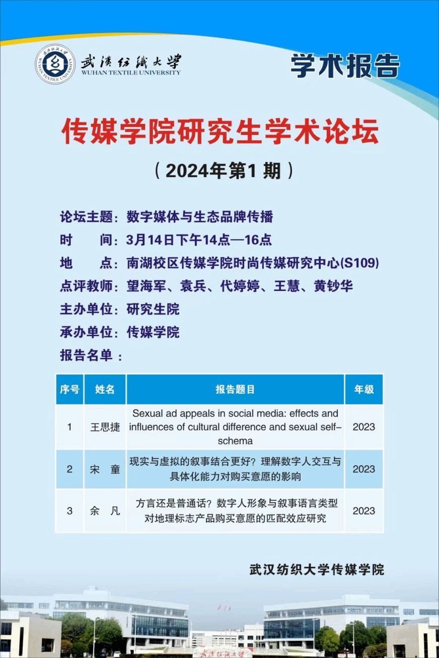 为进一步推动学术研究进展,营造浓厚学术研究氛围,促进研究生的学术交流,3月14日下午14时,2024年第1期研究生学术论坛顺利举行。此次论坛的主题为“数字媒体与生态品牌传播”,365英国上市袁兵、代婷婷、王慧、黄钞华等研究生导师参加本次论坛,新闻与传播专业硕士研究生代表就最近学习成果进行主题汇报。
