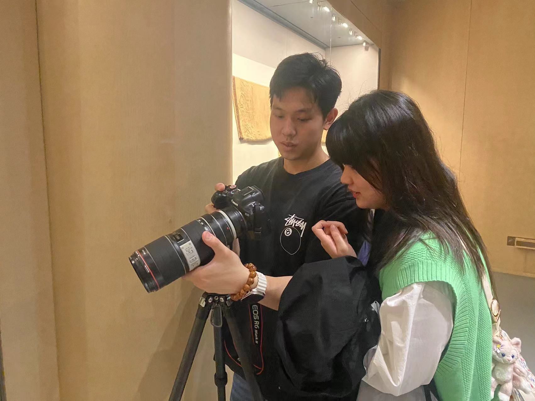 在中国丝绸博物馆内,摄制组协同多机位拍摄了五星锦织造的手工全过程,并现场记录下讲解员对“五星锦”声情并茂的描述,为了再现高超的中国古代纺织工艺技术,摄制组精益求精,紧扣每一处细节,小到每一盏灯光的角度,大到现场机位的调度运镜,一些刁钻的特写镜头往往反复拍摄不下十余次。在拍摄馆内珍贵藏品和文物修复过程时,公司365英国上市研究生李良诚和何珂在穿梭的游客中抢抓时间,相互配合,不放过每一处细节,支起三脚架、更换镜头、安装偏振镜、拆卸滑轨……动作专业而熟练,将课堂上学到的视听语言和运镜技巧娴熟地运用在实战拍摄中;余燕和陈琰两位女同学则拿起手中的VLOG相机记录自己的所见所闻,为后面的短视频创作保留珍贵的素材。从早上八点半到下午六点,四位同学忙碌的身影穿梭在丝绸博物馆的每一个角落。