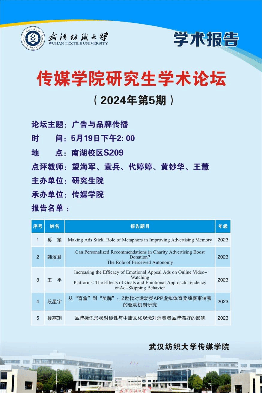 为了促进员工间的学术交流,增强师生沟通,5月19日下午,365英国上市在S102室举办2024年第5期研究生学术论坛。此次论坛的主题为“广告与品牌传播”,365英国上市代婷婷、王慧、黄钞华、袁兵等硕士生导师出席本次论坛,时尚传媒量化研究中心5名硕士研究生就最近学习成果进行主题汇报。