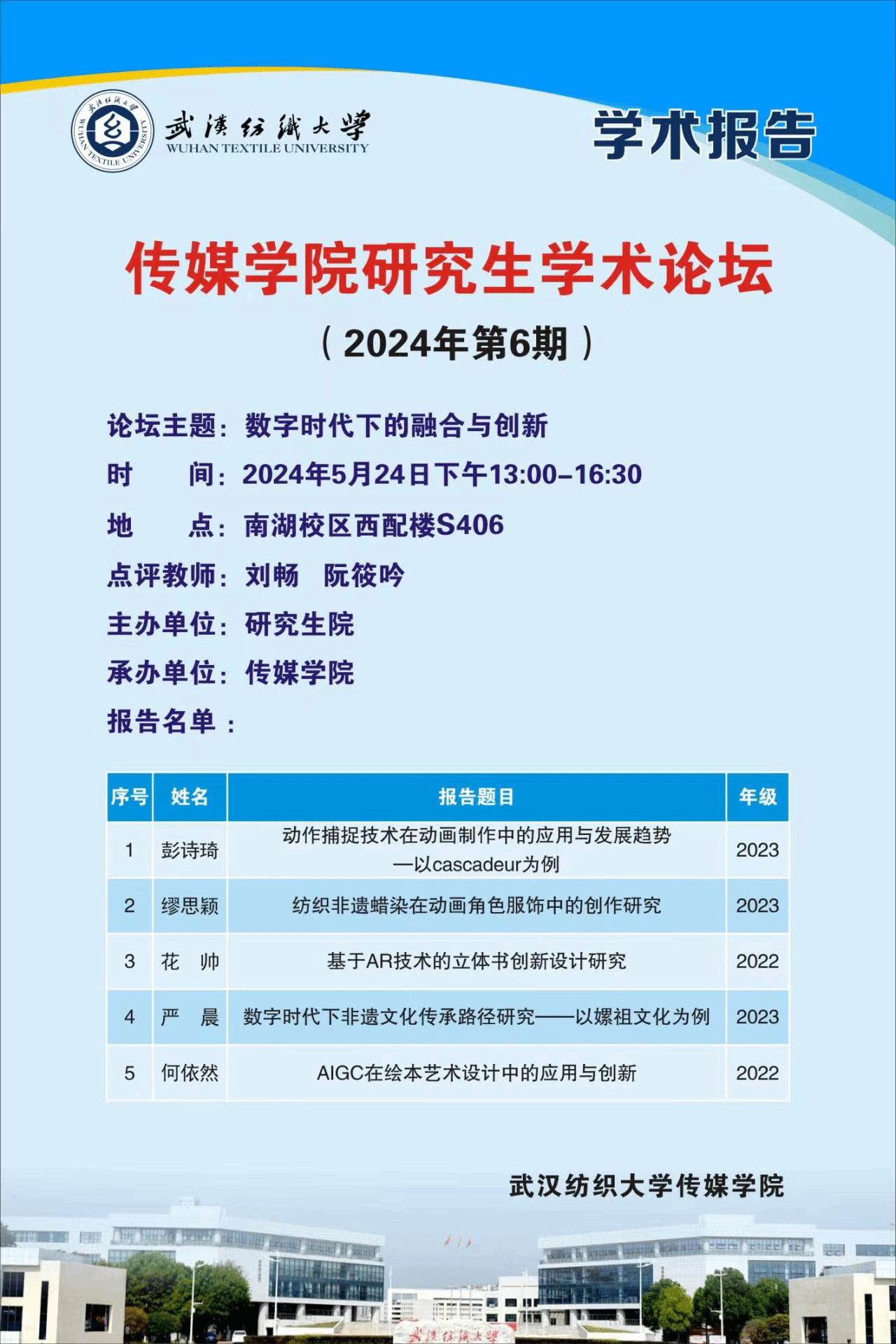 研究生彭诗琦以软件Cascadeur为例,探讨动作捕捉技术在动画制作中的应用与发展趋势;缪思颖在国风动画角色服饰的基础上,融入蜡染艺术,探索非遗纺织文化在动画设计中传承与发展的新途径;花帅通过作品《捺泥模模》AR交互立体书的设计,探索非遗文化保护的新方式,实现传统文化的继承与发展;严晨以嫘祖文化为例,对数字时代下非遗文化传承路径进行研究;何依然以其故事绘本的创作流程为例,展示了AIGC技术在绘本艺术设计中的应用与创新。