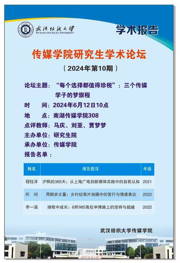 三种别开生面的学术视角,全新的分享体验,感染了在场的每一位参会人员。6月12日,3位传媒学子结合自身逐梦经历,完成“自己与自己对话,自己与理论对话”的田野调查,用心用情诠释2024年第10期研究生学术论坛主题——“每个选择都值得珍视”。