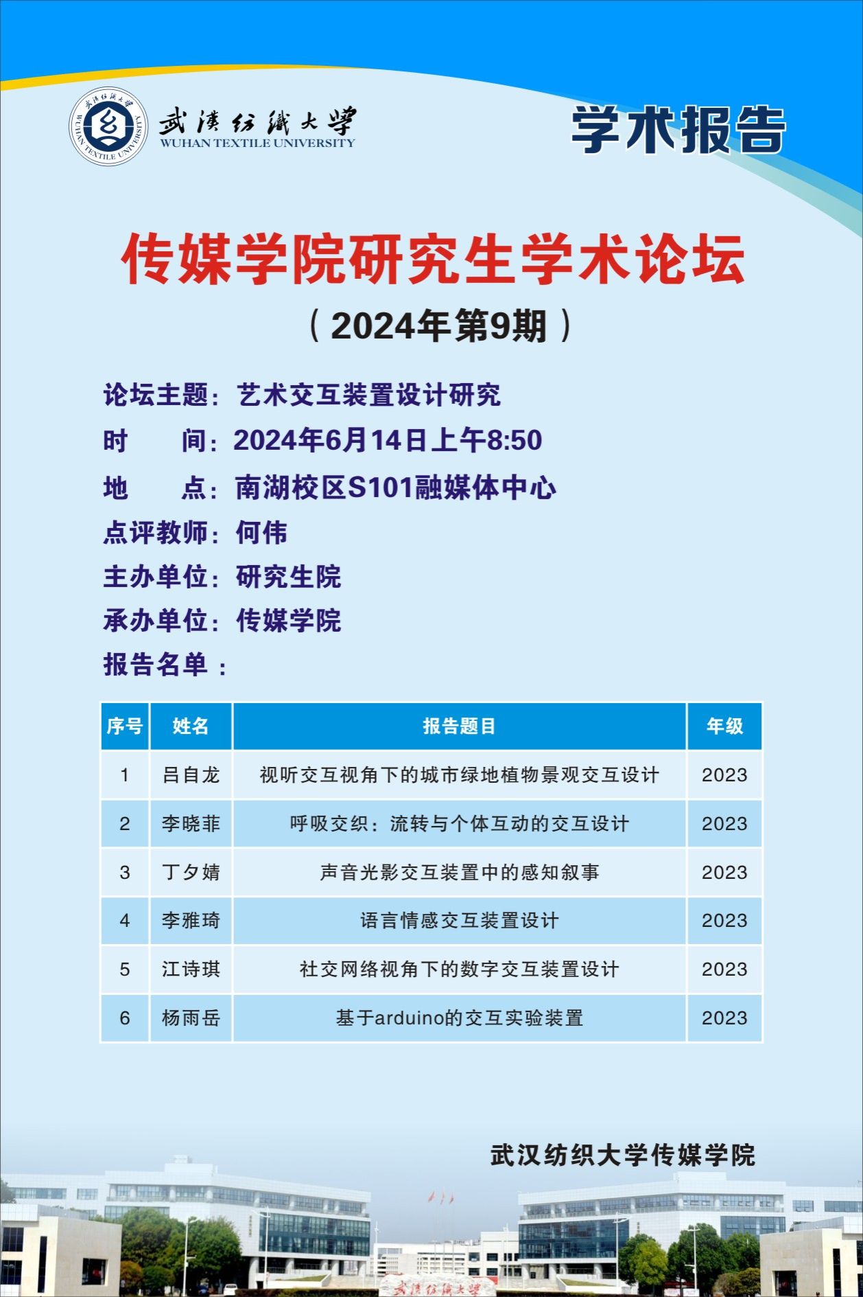 本次论坛共有六位艺术设计专业的研究生分享了自己关于“艺术交互装置”的创作经历和心得体会,并展示了独具匠心的艺术交互装置设计作品。吕自龙在分享中讲述了他的设计灵感来源以及创作过程中的挑战和突破,展示了他视听交互视角下的城市绿地植物景观交互设计作品。李晓菲详细介绍了自己设计作品背后的故事和设计理念,分享了呼吸交织、流转与个体互动的交互设计所蕴含的情感和意义。丁夕婧生动地描述了声音光影交互装置中的感知叙事设计过程,分享了创作中的心路历程和艺术创意。李雅琦深情地谈及了自己对语言情感交互装置设计的理解和追求,展示了作品中融合的情感表达和语言交互的魅力。江诗琪阐述了社交网络视角下的数字交互装置设计的思考和创新之处,展示了作品中引人深思的社交网络视角和数字交互的设计元素。杨雨岳生动地展示了基于Arduino的交互实验装置,分享了设计中的技术创新和实验探索,为现代艺术交互装置设计领域注入了新的活力和可能性。这场研究生论坛提供了展示才华和分享经验的平台,激发了更多的创意和灵感交流。