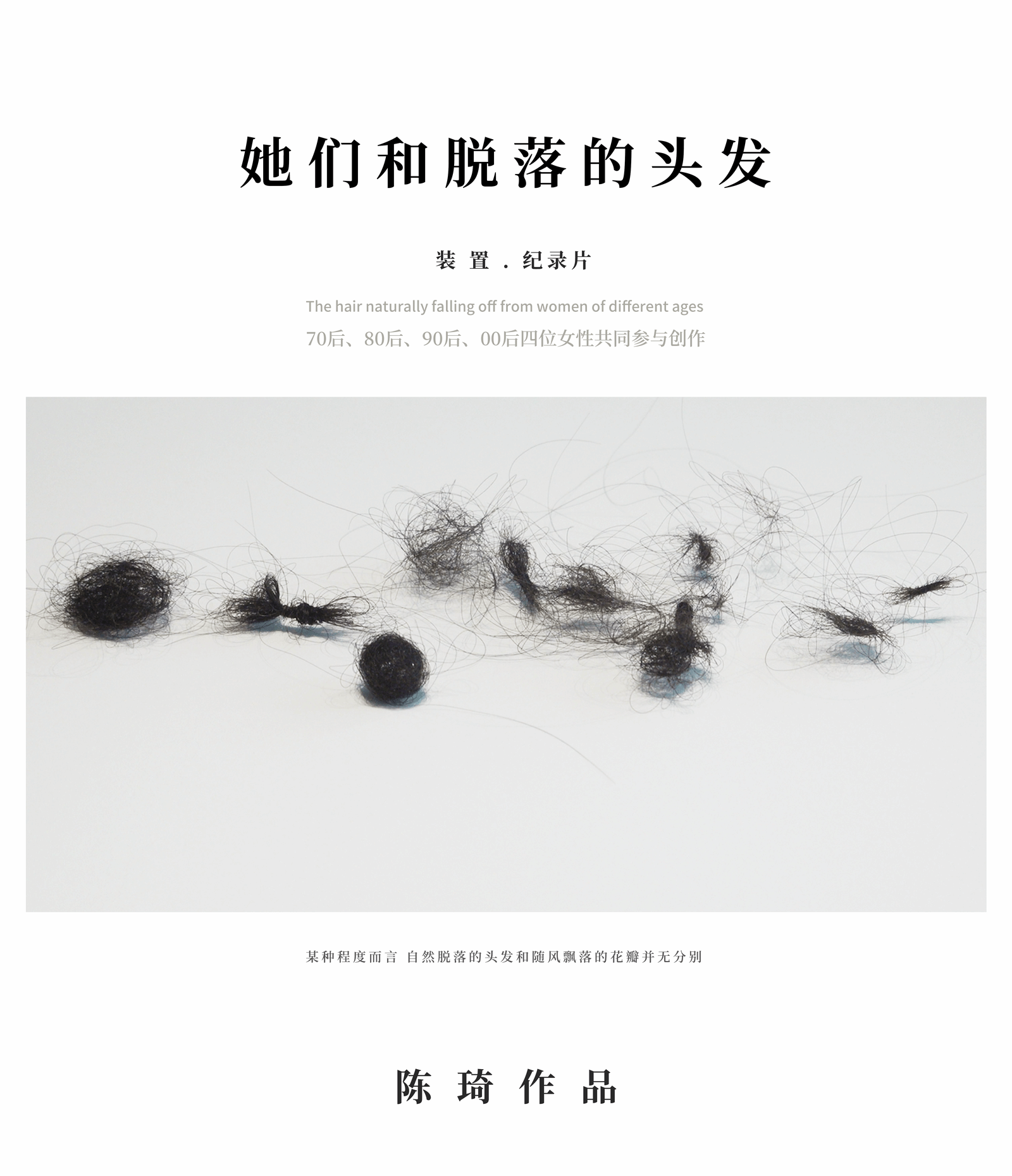 《她们与脱落的头发》是一件以当下女性脱发为主题的艺术作品,邀请出生于七零年代、八零年代、九零年代和千禧年的四位女性收集阳康以后自然脱落的头发来构建作品并用纪录片呈现背后的故事。古有身体发肤受之父母,结发夫妻之说,而当下,脱落的头发成了生活里的废弃物和烦恼。从古至今,我们经历了从青丝、云鬓的审美,到现在所熟知的黑长直、大波浪。就存在的时间而言,头发的物质结构似乎比人的生命更长久。在这样一个焦虑的时代,落在地上和梳子上的头发里“她们”向前。卷着灰尘,裹挟在流逝的岁月里、生活的琐碎内焦虑的内卷下、感染新型冠状病毒感染后,作品旨在与脱发中的“她们”产生一场对话。
