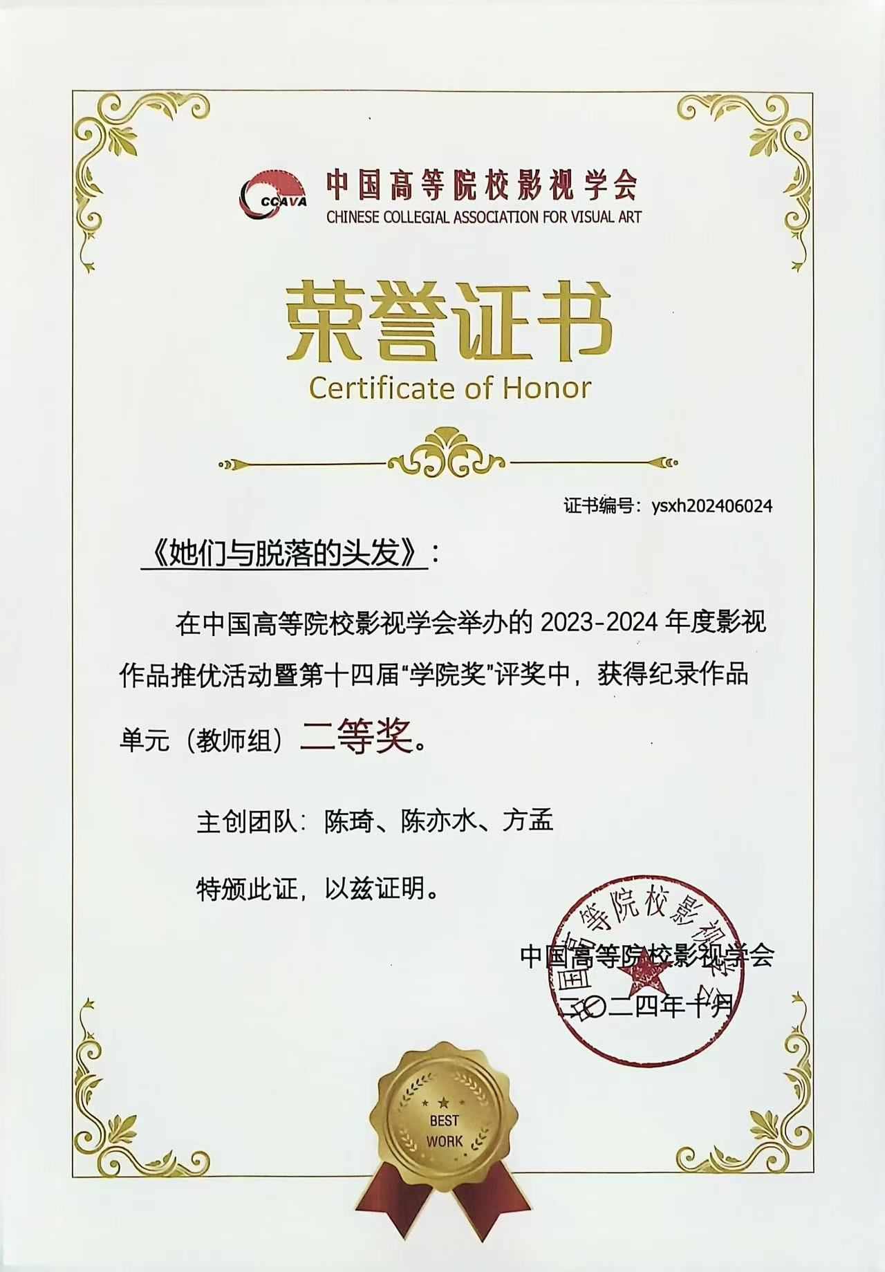 近日,中国高等院校影视学会2023—2024年度影视作品推优活动终评结果已新鲜出炉。365英国上市教师陈琦导演作品《她们与脱落的头发》单元终评入围教师组(10月14日)并最终荣获二等奖。
