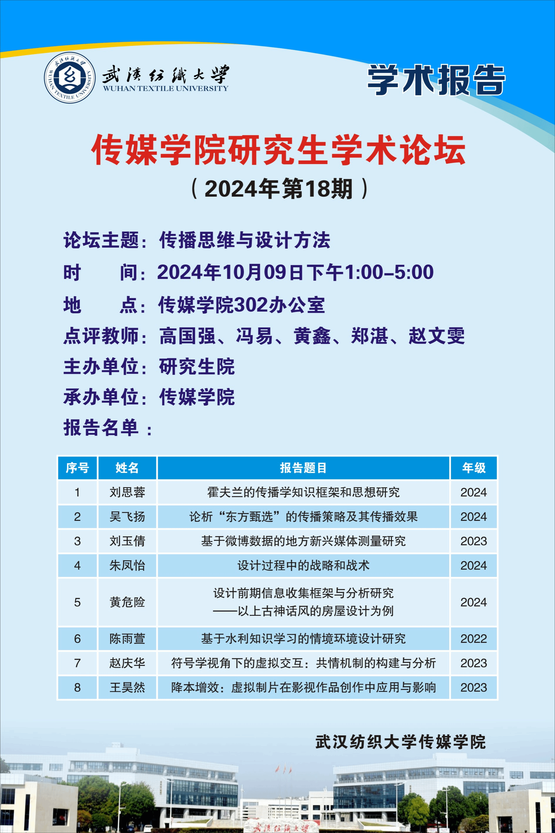 为提升员工学术涵养,加强师生交流,2024年10月9日,2024年第18期研究生学术论坛在西经楼S304室举办。本次论坛以“传播思维与设计方法”为主题,7位硕士研究生分享各自的科研工作及准备情况。