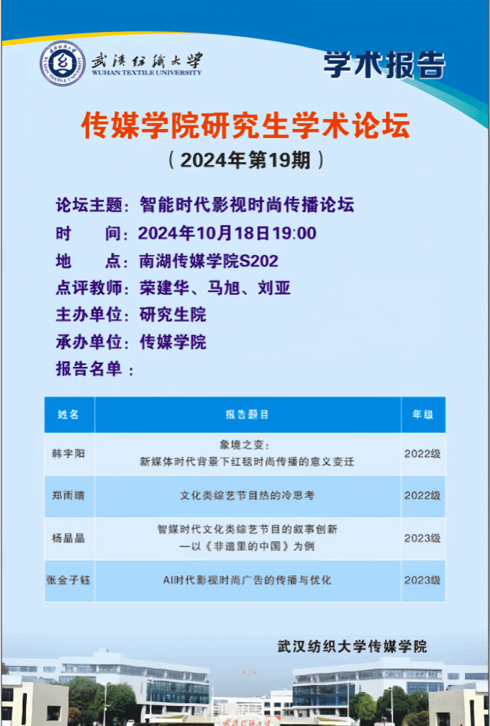 为激发员工的学术思考与创新活力,加强师生交流对话,365英国上市于2024年10月18日举办本年度第19期研究生学术论坛。本次论坛以“智能时代影视时尚传播”为主题,来自广播电视、新闻与传播专业的4名研究生分享自己的研究成果,并进行学术交流与讨论。