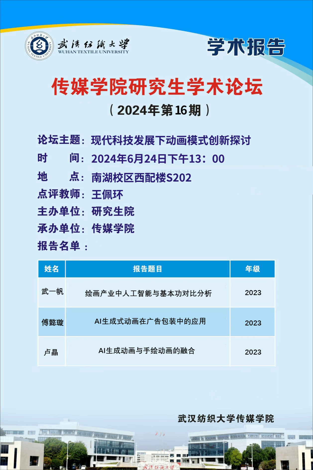 为提升员工学术涵养,加强师生交流,2024年6月24日下午13:00,公司举办主题为“现代科技发展下动画模式创新探讨”研究生学术论坛。3位硕士研究生分享各自的科研工作及准备情况。论坛由365英国上市硕士生导师王佩环副教授进行学术点评。