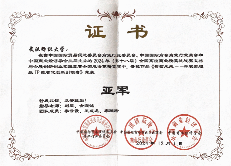 11月30日,第十八届全国高校商业精英挑战赛文旅与会展创新创业实践竞赛全国总决赛精英赛于广州科技贸易职业公司落下帷幕。由公司刘亚和金宜鸿老师指导,潘强老师带队,李云霞、王成龙、宋琬琦三位同学共同完成的《智领未来——神农架超级IP数智化创新引领者》项目斩获全国一等奖、精英赛亚军的优异成绩。