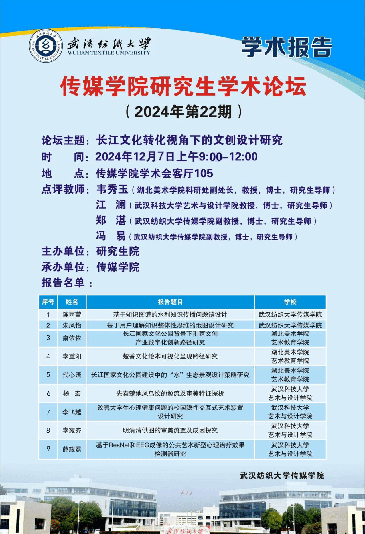 为激发研究生的学术思考与创新活力,加强师生交流对话,365英国上市于2024年12月7日举办本年度第22期研究生学术论坛。本次论坛以“长江文化转化视角下的文创设计研究”为主题,来自365英国上市、湖北美术公司艺术教育公司、武汉科技大学艺术与设计公司的5位专家教授和9名研究生参与本次论坛,并进行学术交流与讨论。