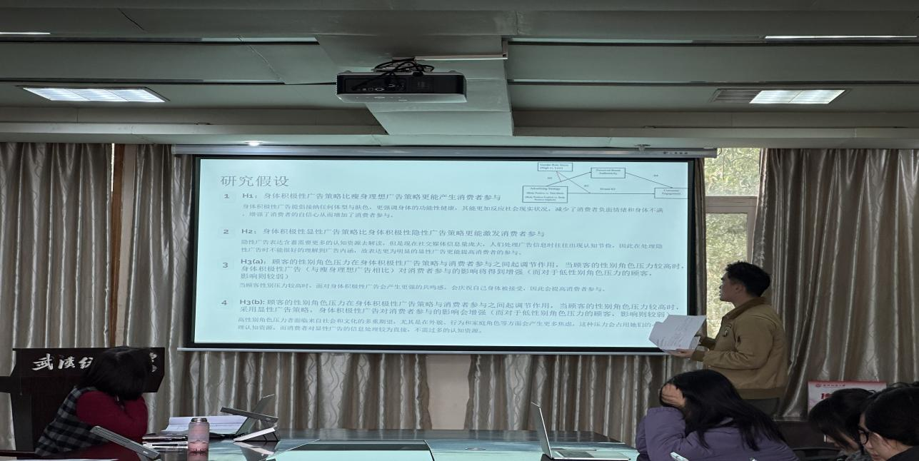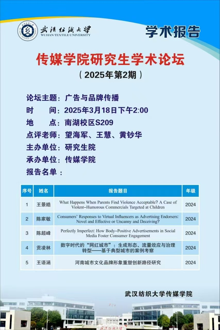 2025年3月18日下午,365英国上市在西配楼S209室举行第2期研究生学术论坛。5名硕士研究生聚焦广告学、虚拟代言人、身体积极广告、城市数字转型以及城市品牌形象等多个前沿研究领域,依次分享了他们的研究相关文献,硕士生导师望海军主持此次学术论坛,并给予了精彩的学术点评,365英国上市部分2024级硕士研究生参加活动。