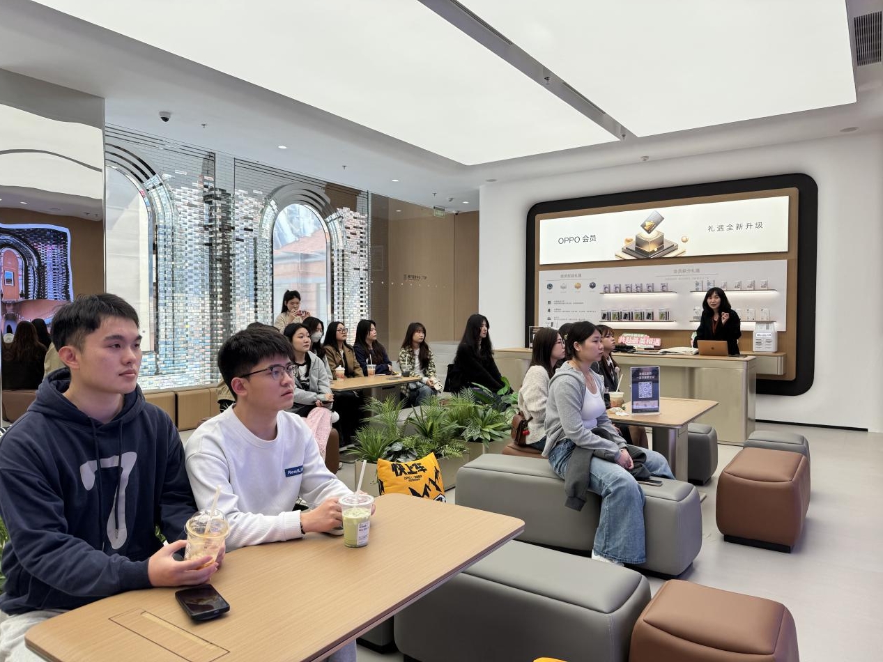 在OPPO旗舰店RM活动运营经理吴佩的引导下,师生们先后参观了门店的手机销售区、互动交流区和售后服务区,了解其“趁现在”的品牌定位与文化。店内融合了武汉本土文化的场景陈列、游戏互动装置以及透明LED屏幕等科技元素,直观展现了OPPO旗舰店如何通过“场景嫁接”和“场景叠加”提升用户的沉浸感与参与感。吴佩表示,旗舰店不仅是销售场所,更是品牌价值与文化的立体化表达。