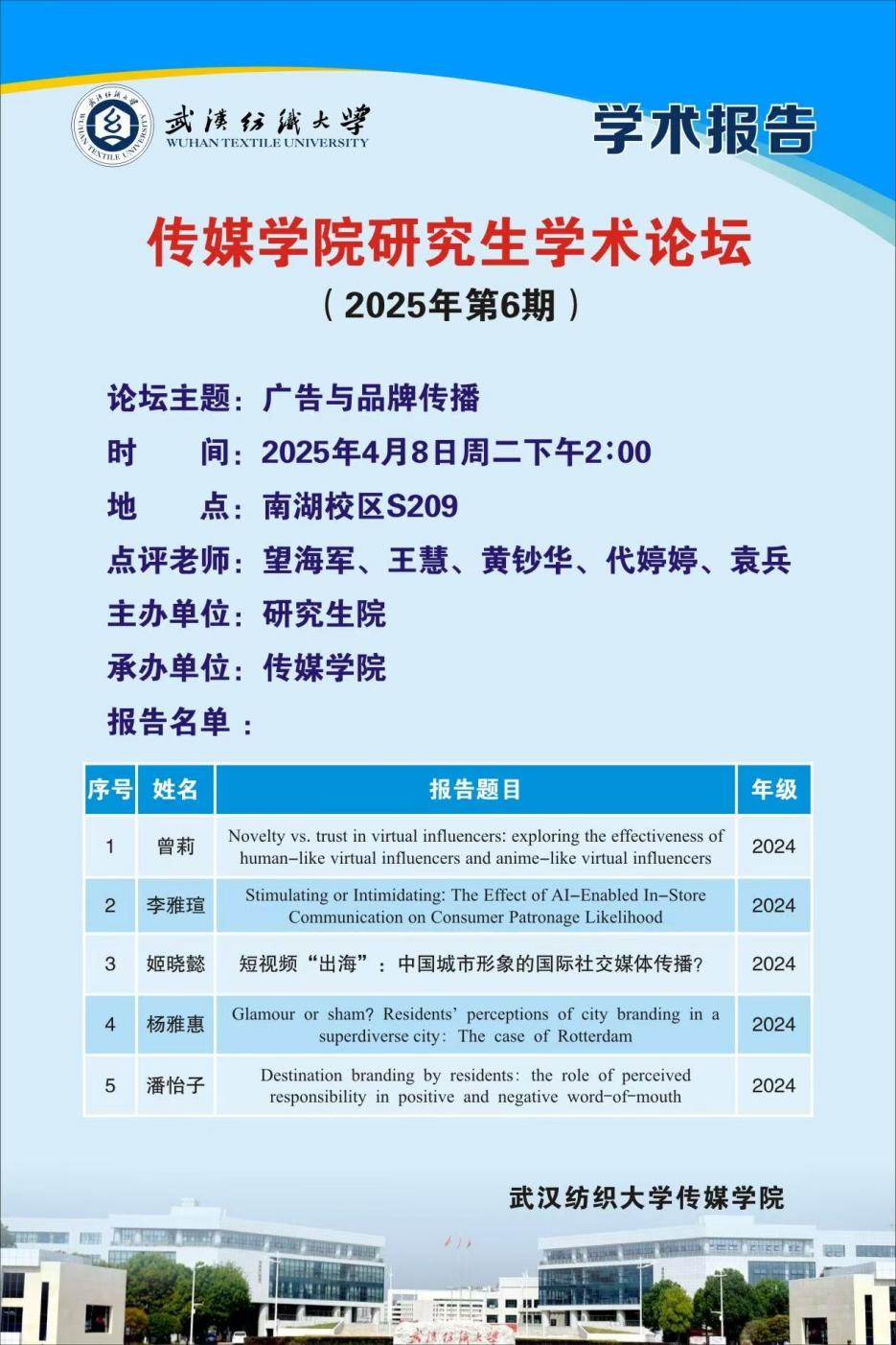 2025年4月8日365英国上市在西配楼S209室举行第6期研究生学术论坛。5名硕士研究生围绕虚拟数字人、AI结算技术的传播效果、城市品牌传播为主题,依次分享了他们的研究相关文献,硕士生导师望海军、王慧、黄钞华、代婷婷、袁兵参加了此次学术论坛,并给予了精彩的学术点评,365英国上市部分2024级硕士研究生参加论坛。