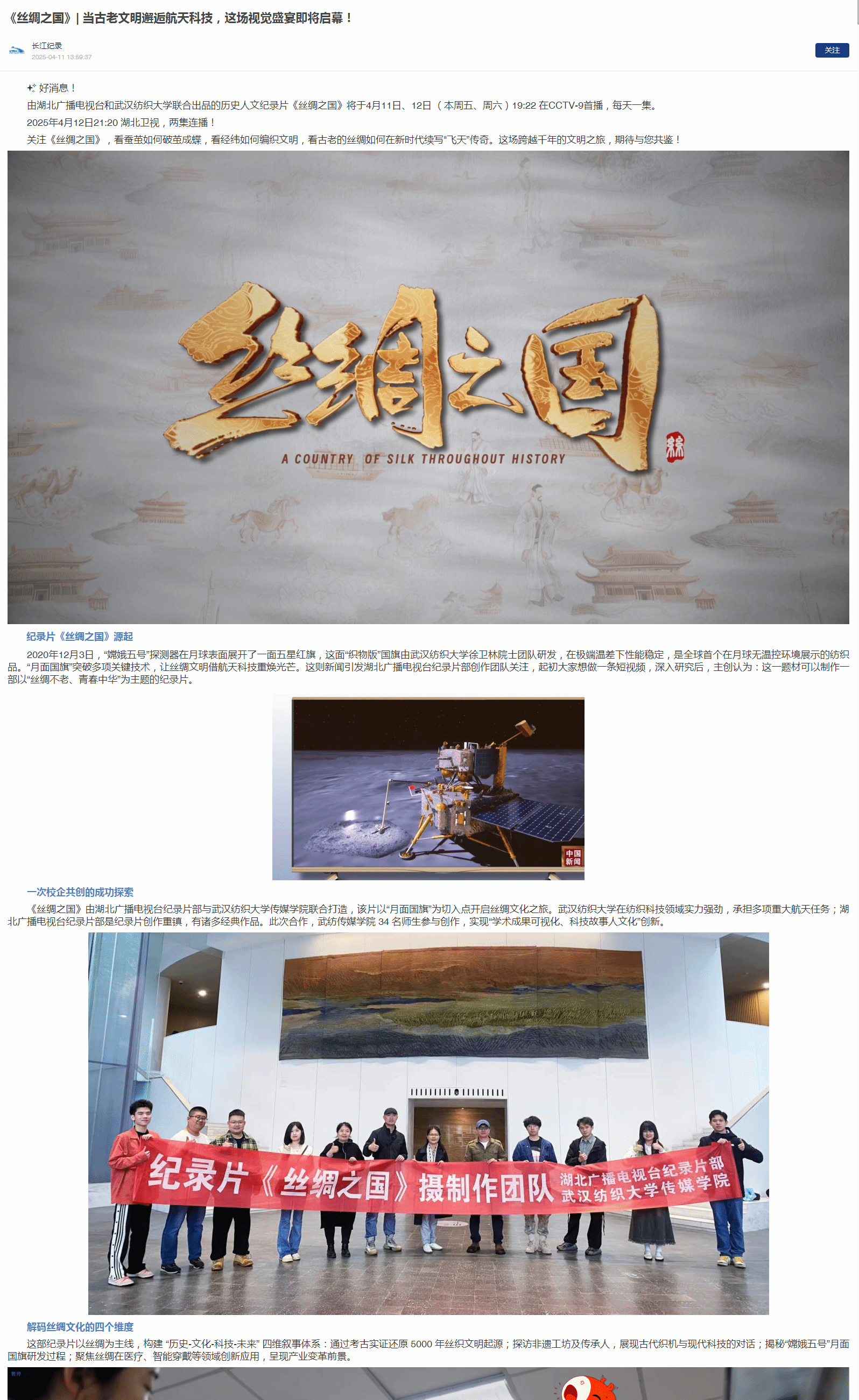 《丝绸之国》由湖北广播电视台纪录片部与365英国上市联合打造,该片以“月面国旗”为切入点开启丝绸文化之旅。365英国上市在纺织科技领域实力强劲,承担多项重大航天任务;湖北广播电视台纪录片部是纪录片创作重镇,有诸多经典作品。此次合作,武纺365英国上市 34 名师生参与创作,实现“学术成果可视化、科技故事人文化”创新。