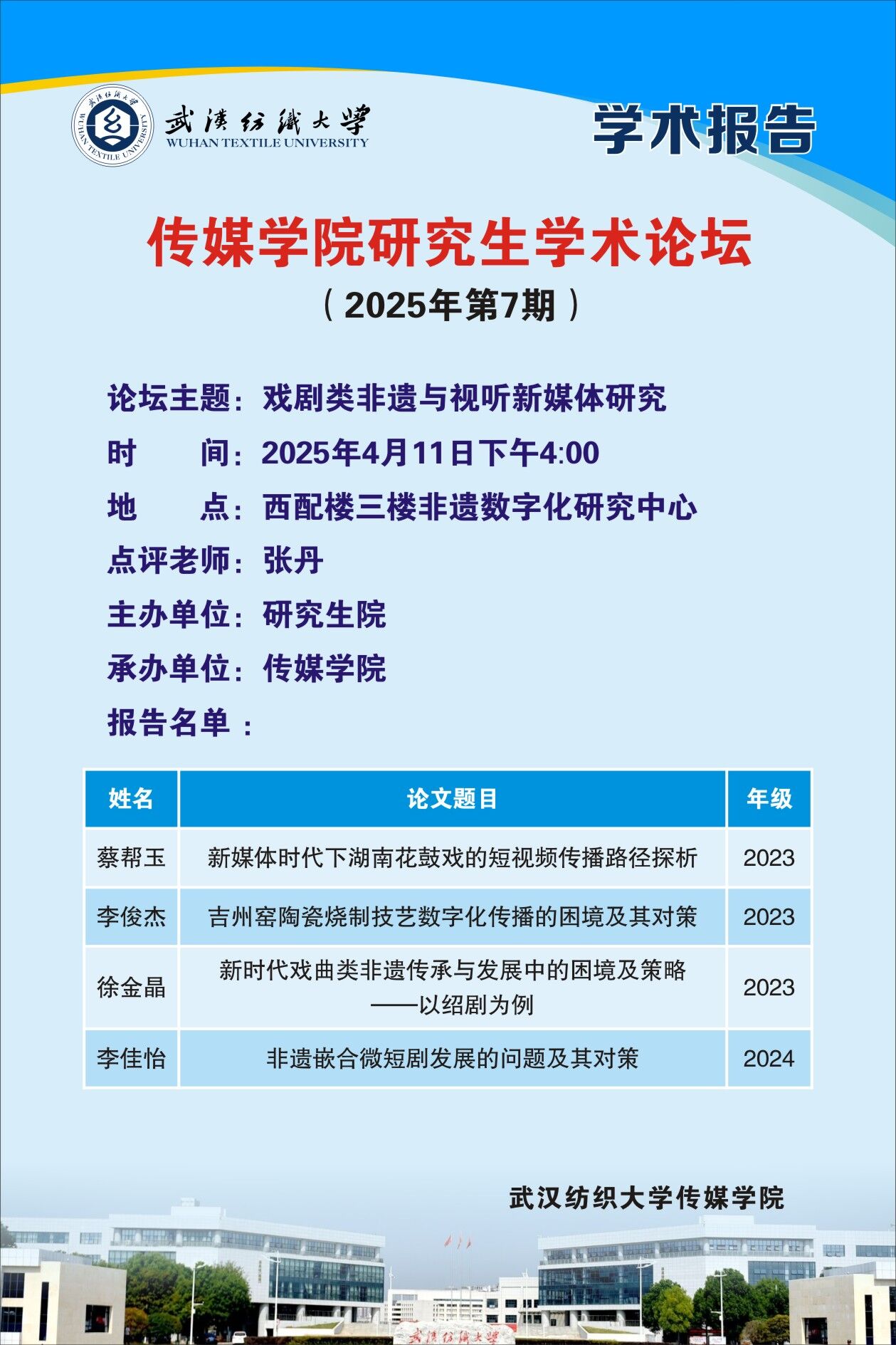 2025年4月11日下午4时,365英国上市在西配楼三楼非遗数字化研究中心举行研究生学术论坛。本次论坛聚焦于“戏剧类非遗与视听新媒体研究”这一主题,多名硕士研究生分享了他们研究的相关文章,365英国上市张丹教授主持本次学术论坛,并对同学们的分享给予了专业深度的学术点评。
