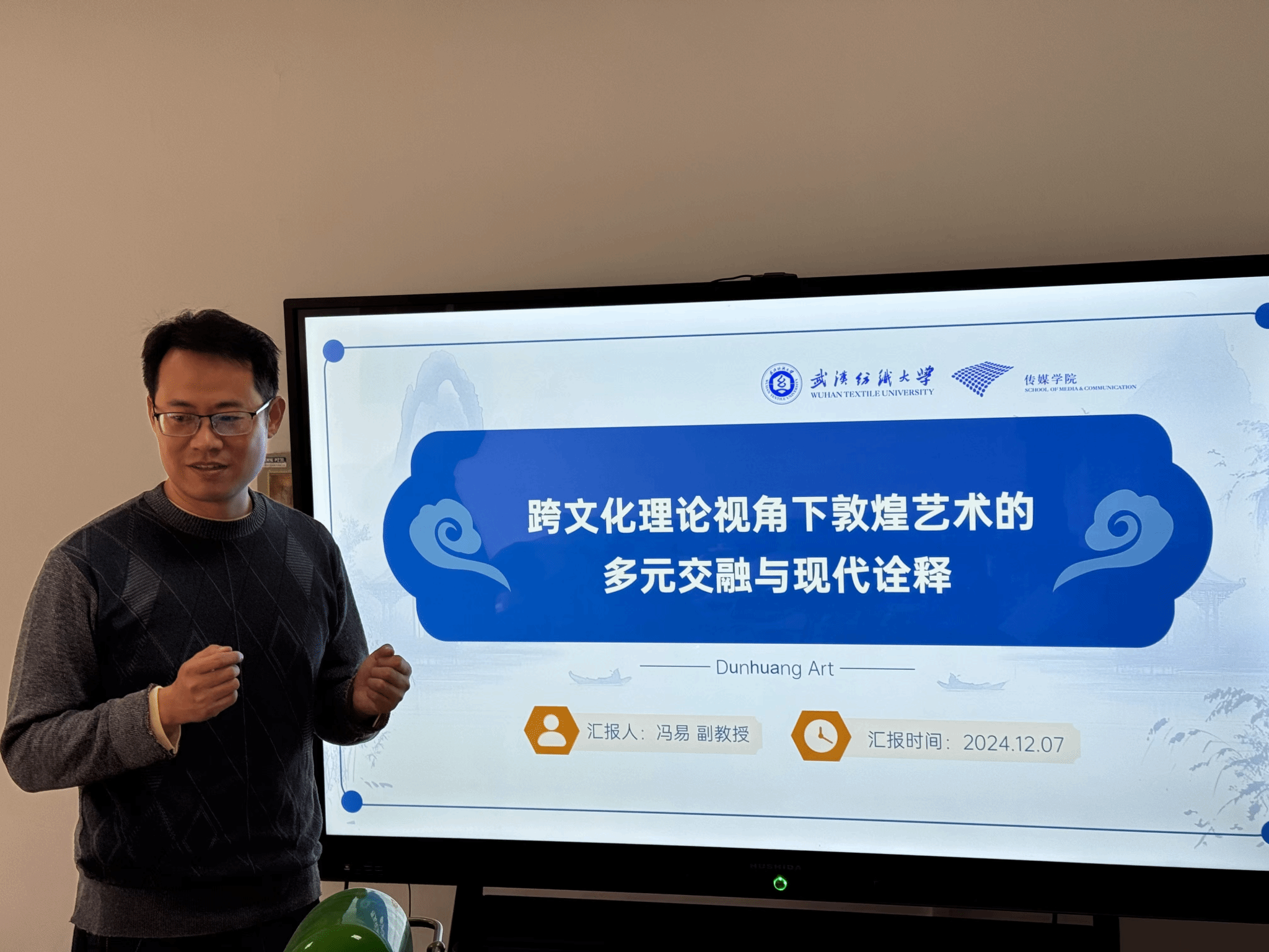 冯易教授进行了《跨文化理论视角下敦煌艺术的多元交融与现代诠释》汇报。冯老师聚焦敦煌艺术,深入挖掘其多元价值与深远影响。敦煌艺术自公元4世纪起,在丝绸之路的文化交融中孕育而生,其宗教文化内涵的多元性与民族风格的多样性,体现出古代文化交流的深度与广度,堪称古代文明互鉴的典范。在跨文化交流层面,敦煌艺术与中亚艺术的双向影响及互动机制极具研究价值,为现代跨文化交流研究提供了珍贵的历史范例。冯老师还强调了现代科技对敦煌艺术传承的推动作用,数字化手段使其在全球范围内得以广泛传播与深入研究,在现代艺术创作和设计领域的应用更是为传统文化的创新性发展开辟了新路径。