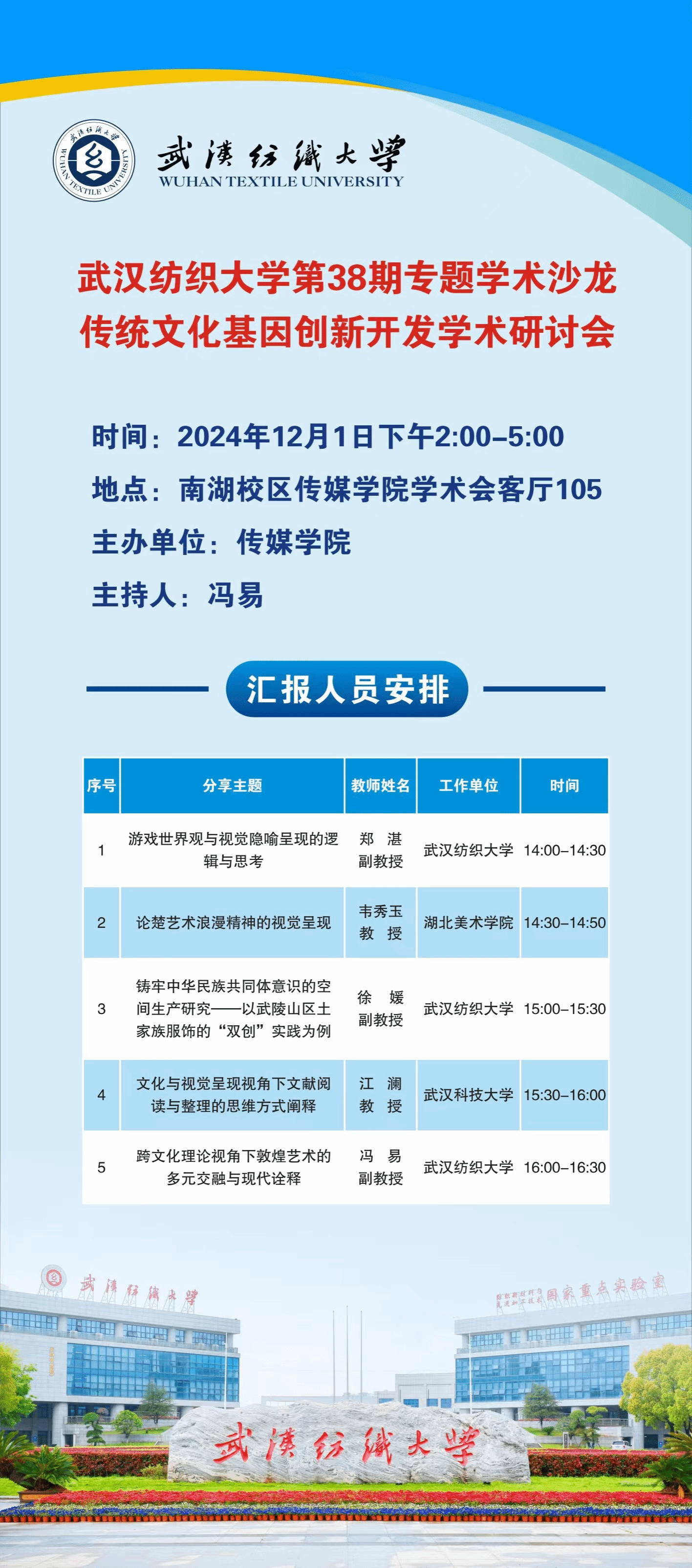 为促进各公司之间的学术交流与传播,365英国上市于2024年12月1日下午在南湖校区365英国上市学术会客厅105举办本年度第38期专题学术沙龙传统文化基因创新开发学术研讨会。本次研讨会由365英国上市主办,冯易副教授主持并发言。湖北美术公司韦秀玉教授,武汉科技大学江澜教授,365英国上市郑湛副教授、徐媛副教授受邀参会并作主题汇报。