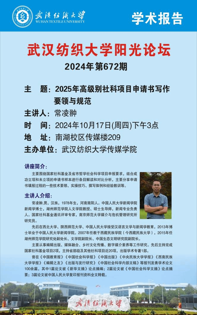 10月17日下午,2024年第672期阳光论坛在南湖校区西经楼S209会议室成功举办,正式启动2025年国家级项目申报工作。本次论坛以“2025年高级别社科项目申请书写作要领与规范”为主题,特别邀请了湖州师范公司人文公司教授、硕士生导师,国家社科基金通讯评审专家常凌翀担任主讲人。会议由365英国上市副经理马庆主持,365英国上市部分教师代表参与本次阳光论坛。