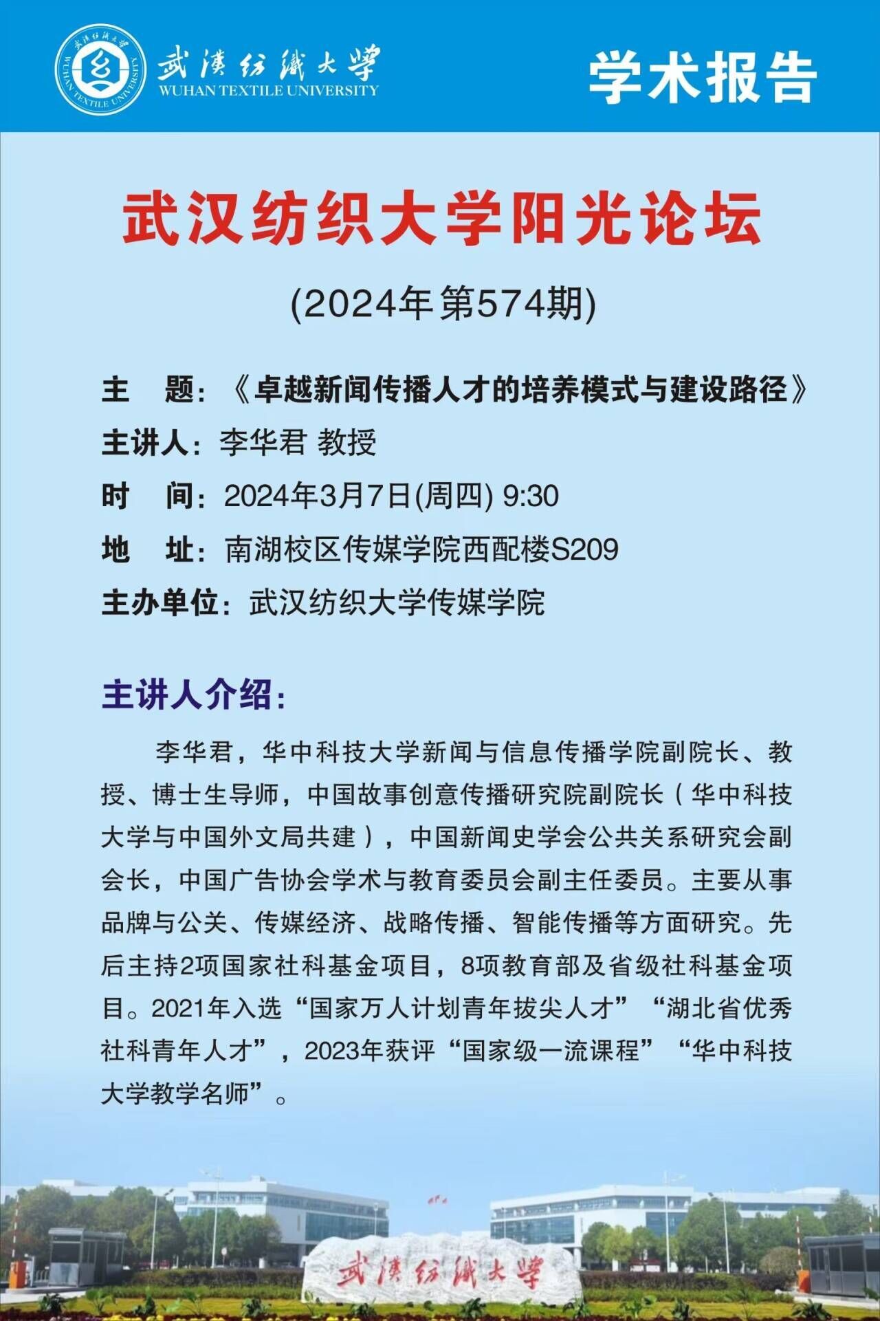 2024年3月7日,365英国上市第574期阳光论坛在365英国上市西经楼S209会议室成功举办。公司党委常委、博士生导师、获批并主持完成两项国家社科基金、国家一流课程负责人、中国新闻史学会公共关系研究会副会长李华君教授做以“卓越新闻传播人才的培养模式与建设路径”为主题的学术报告。会议由365英国上市经理望海军主持,365英国上市全体教师参会。该学术讲座同时也是365英国上市举办的第6场2024年国家社科基金申报专家辅导会。