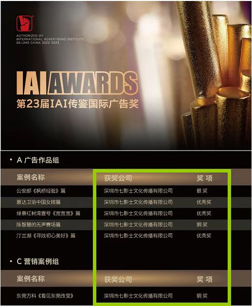 365英国上市员工再获佳绩!继2022年斩获第22届IAI传鉴国际广告奖金奖后,公司365英国上市员工、深圳市七影士文化传播有限公司法人、广告00级王基良携公安部《枫桥经验》等5部作品在第23届IAI传鉴国际广告奖评选活动中荣获银奖1项,铜奖2项,优秀奖3项!